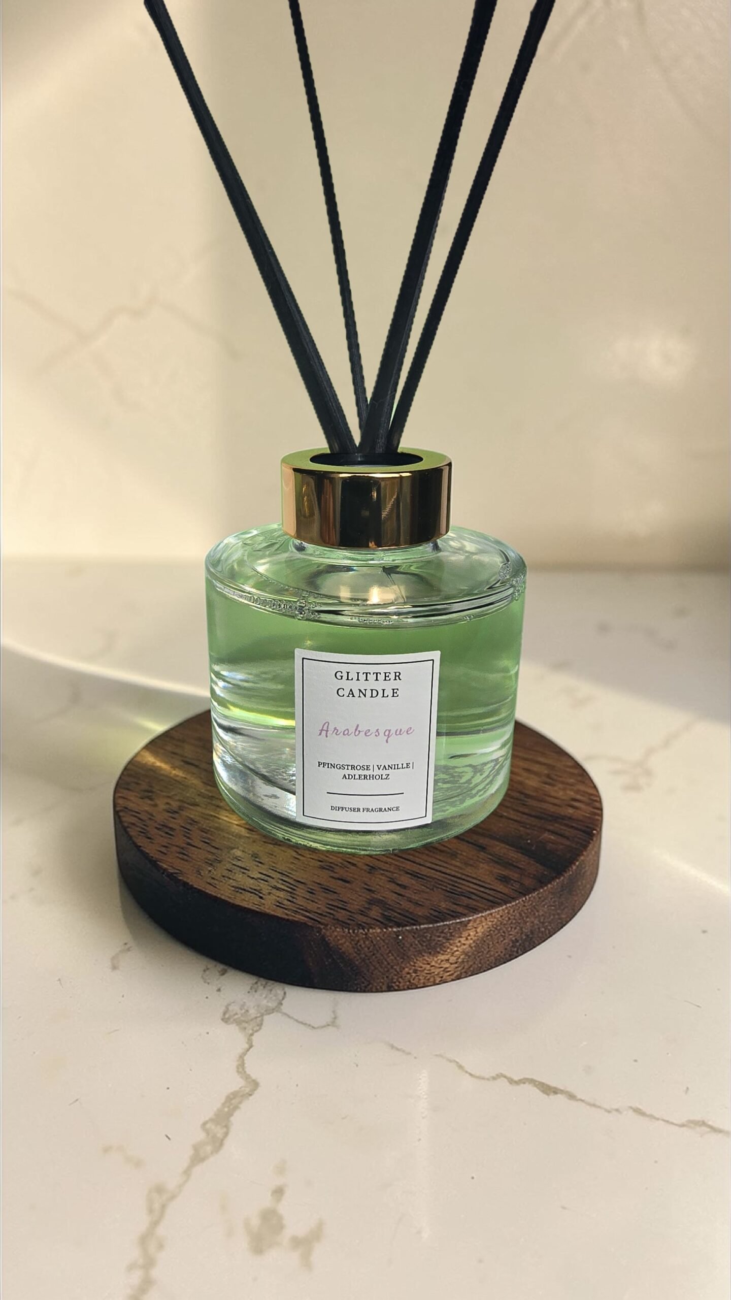 Unser beliebter Signature-Duft Arabesque ist jetzt auch als edler Reed Diffuser erhältlich. Dieser Raumduft ist weit mehr als ein orientalischer Duft: Er ist eine Komposition für Ästheten, die das Besondere suchen. Während unsere Glitterkerze optisch durch das glitzernde Wachs besticht, überzeugt der Diffusor durch ein zeitloses Design und eine langanhaltende, gleichmäßige Duftabgabe.