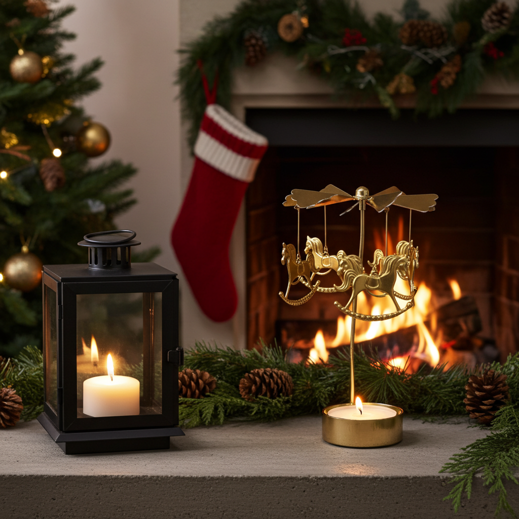 Dieses goldene Teelichthalter-Windlicht ist ein echter Blickfang und ideal als Weihnachtsdekoration oder Geschenkidee. Die schwebenden Schaukelpferde erinnern an klassische Weihnachtsmärkte und versprühen festliche Nostalgie – perfekt für eine gemütliche Atmosphäre in der Adventszeit.